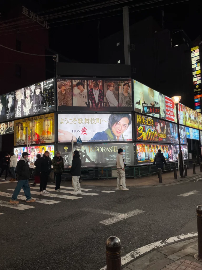4.Observe the Host Clubs: As you move further north and east into the 2-chome area, you will notice large, stylized photos of male hosts outside buildings. This is the main host club district. Observation is from the street only.