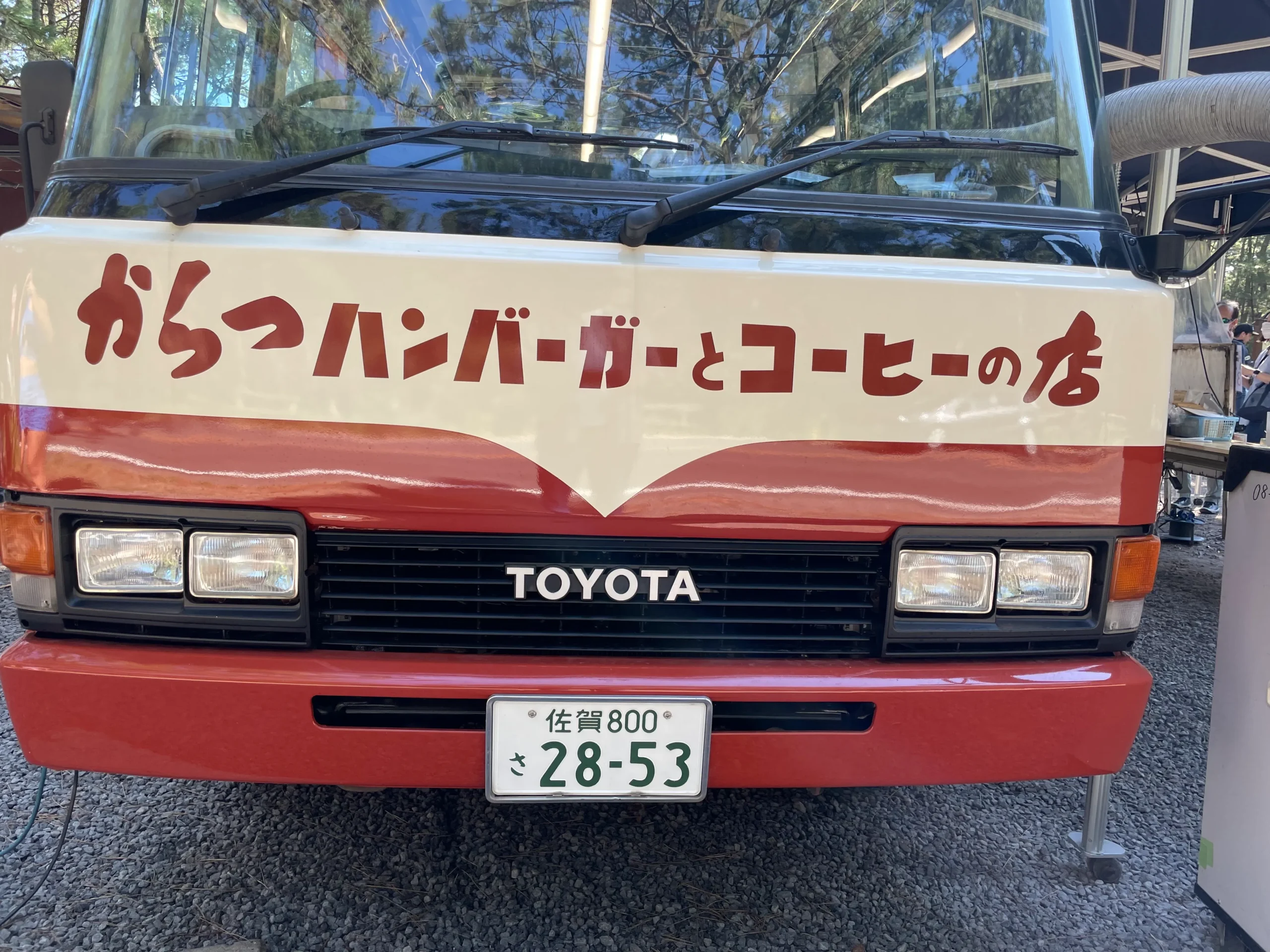 We drove from Karatsu city and parked near the pine forest. The shop is a red retro bus, easy to spot. Inside the bus, you order at a counter and pay immediately. You receive a buzzer. Then you wait outside on wooden benches, surrounded by tall pine trees.