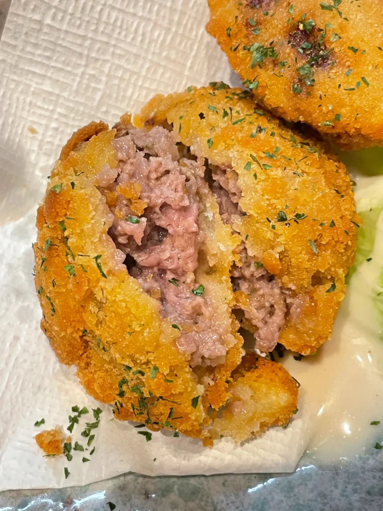 Next came the menchi-katsu, a breaded patty fried golden. It was hot. Cutting into it released steam. Inside was soft, juicy, the meat ground fine. It felt like a completely different dish from the skewer, though made from the same animal.