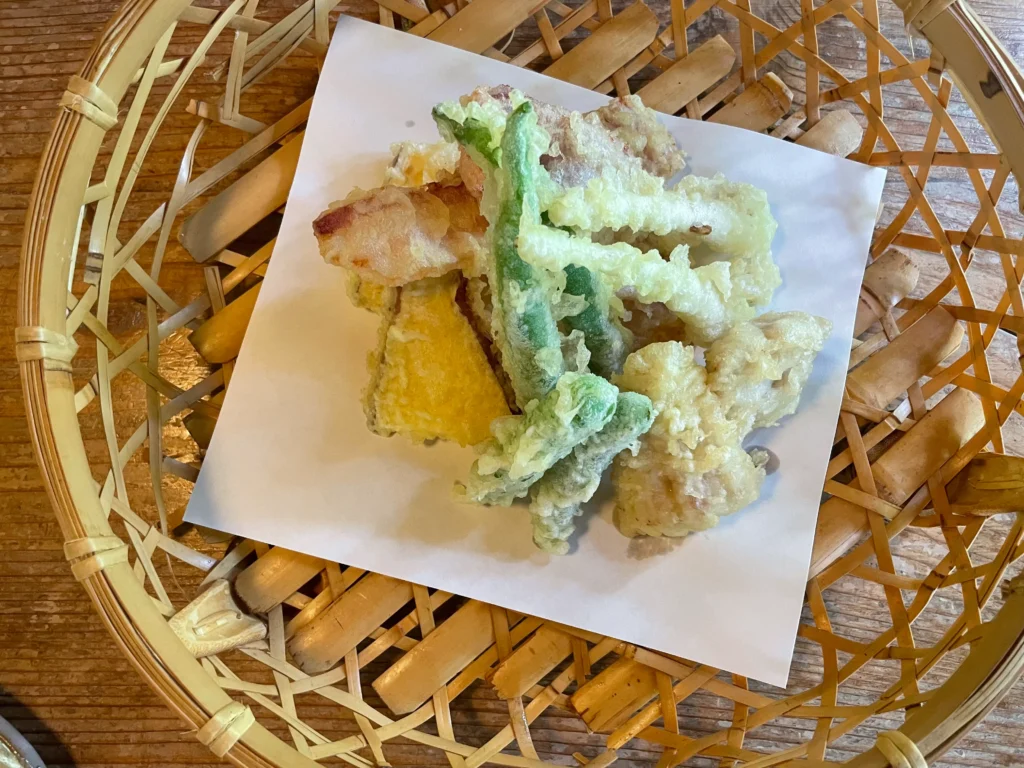 Eating soba at a specialty restaurant in the mountains is a different experience from a quick bowl in the city. The focus is on the noodle itself, the broth, and the quality of the ingredients. At Soba Bunjiro, the soba is made with ten-wari, or 100% buckwheat flour, which means no wheat flour is mixed in. This affects the taste, the texture, and the aroma. The restaurant also serves tempura alongside the soba, a classic pairing. The setting—a relocated restaurant in a quiet, natural area—shapes the meal as much as the food itself.