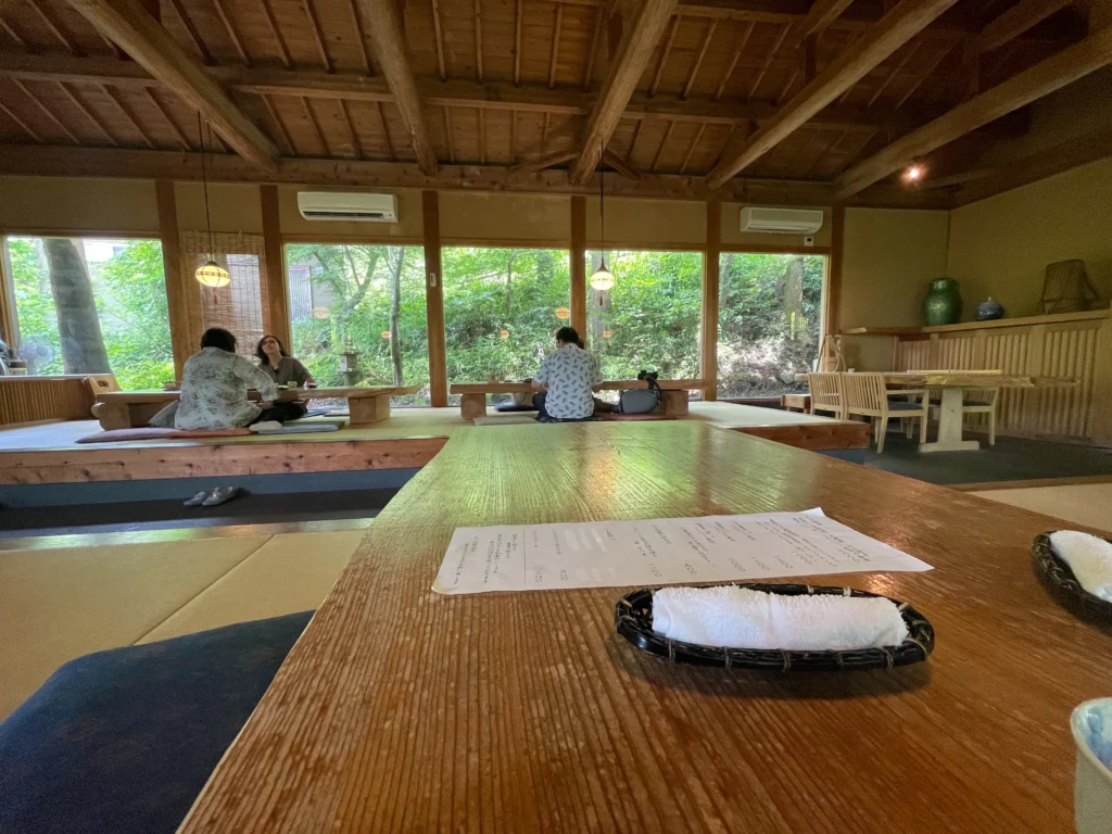 The drive to the restaurant took me through increasingly narrow roads, past rice fields and small houses. The landscape opened up. The restaurant building itself is modern but designed to blend with its surroundings. Inside, the ceiling is high, with large wooden beams. The space feels generous, not cramped. There were other diners, but the atmosphere was calm, almost hushed.