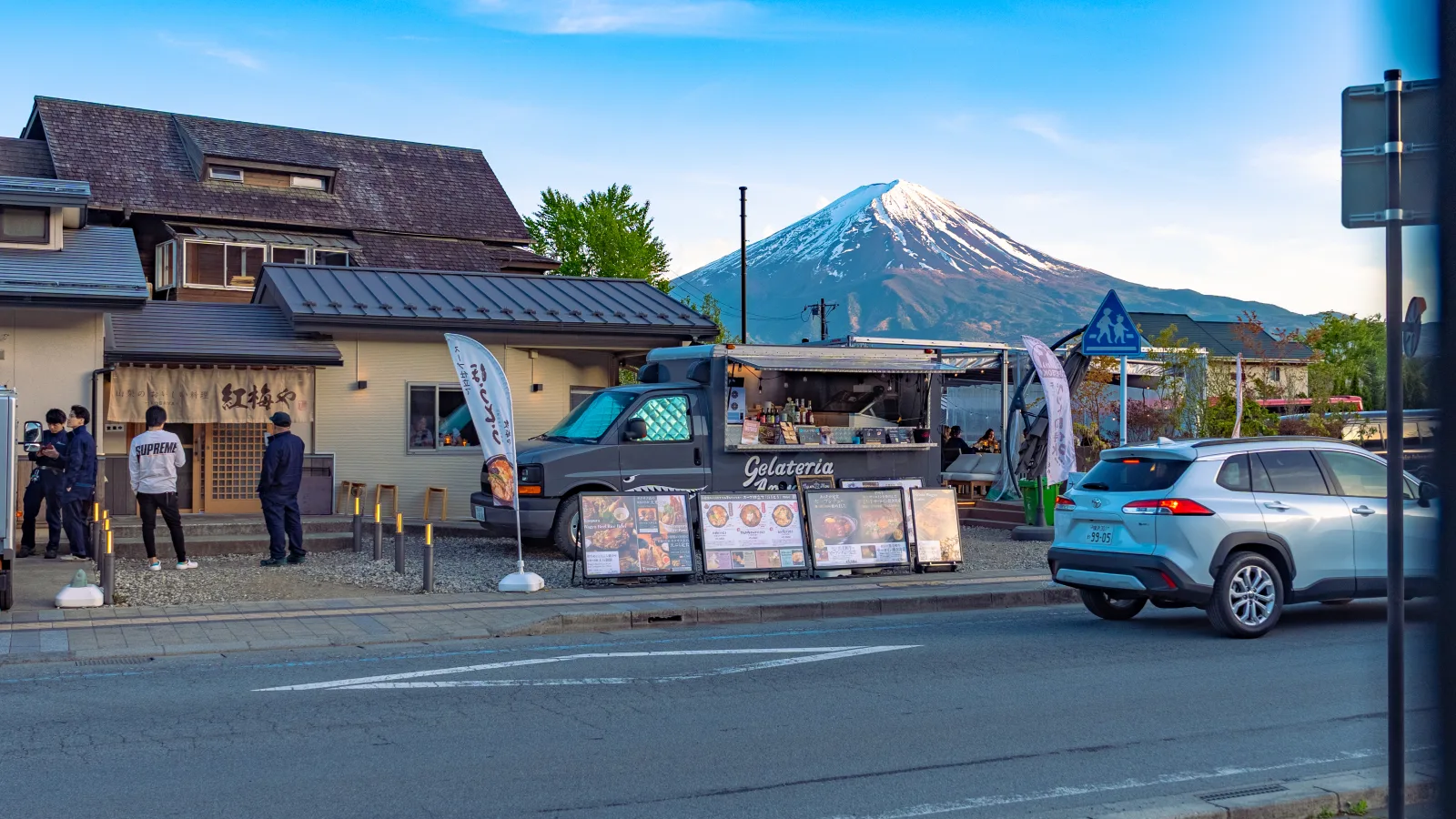 Step back ten metres from the entrance and Mt. Fuji is directly behind the building. There’s a gelato truck parked in the lot next door — good backup if you’re early — and you’ll usually see one or two bikes pulled over as cyclists stop to take the same photo.