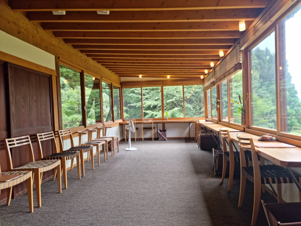 Stepping into Murata Fushoan feels like entering a different world. The interior is bathed in natural sunlight, streaming through large windows that frame the lush Yufuin landscape.