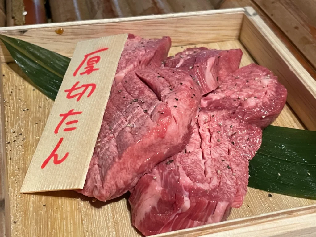 The meat arrived first. The tongue was thick, maybe a centimeter, and scored in a grid pattern. The platter had small, neatly labeled cuts of beef, showing different marbling. You cook each piece yourself, which takes only a minute or two per side. The room filled with the smell of searing beef.