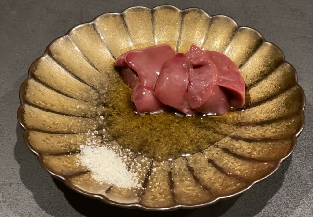 Fresh blood liver (chi-gimo) served raw in an elegant golden scalloped dish with salt at Yakitori Mamori