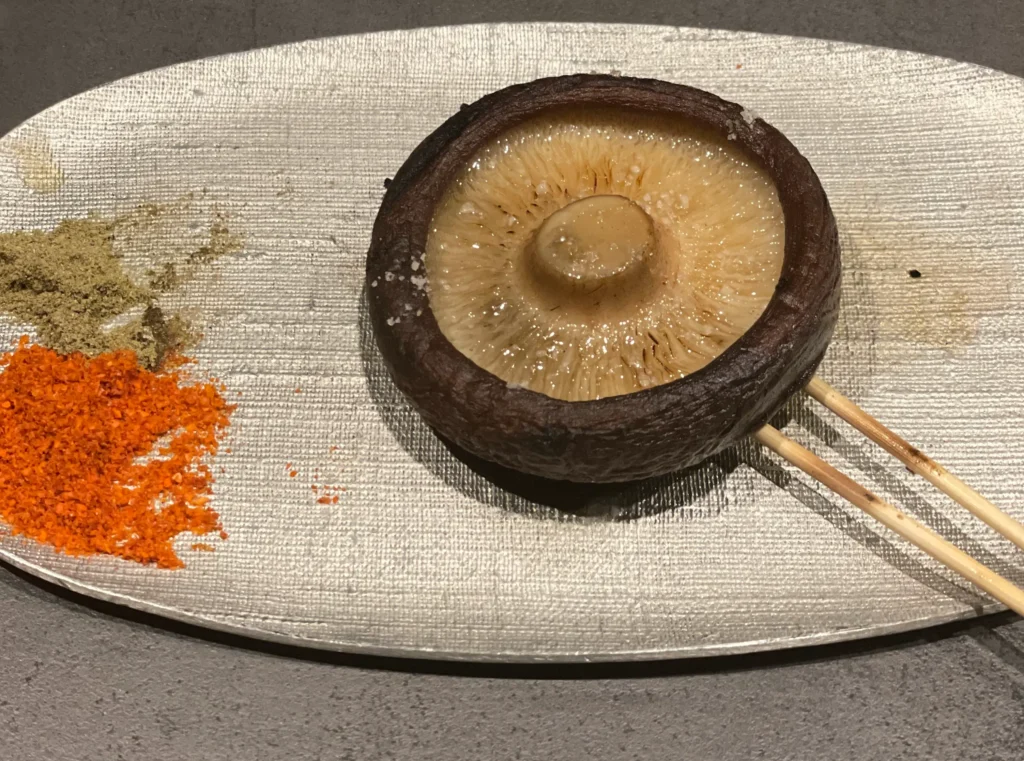A large whole shiitake mushroom grilled over binchotan charcoal, served with shichimi togarashi and sansho pepper