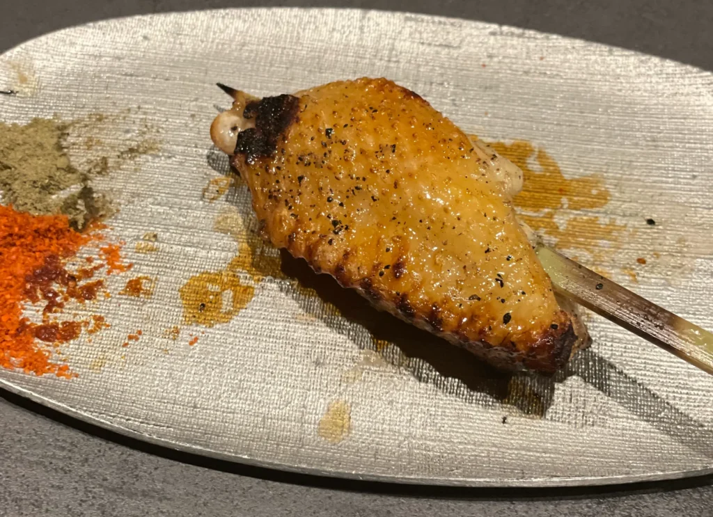 A golden-brown grilled yakitori skewer of premium chicken shoulder meat served with shichimi and sansho pepper